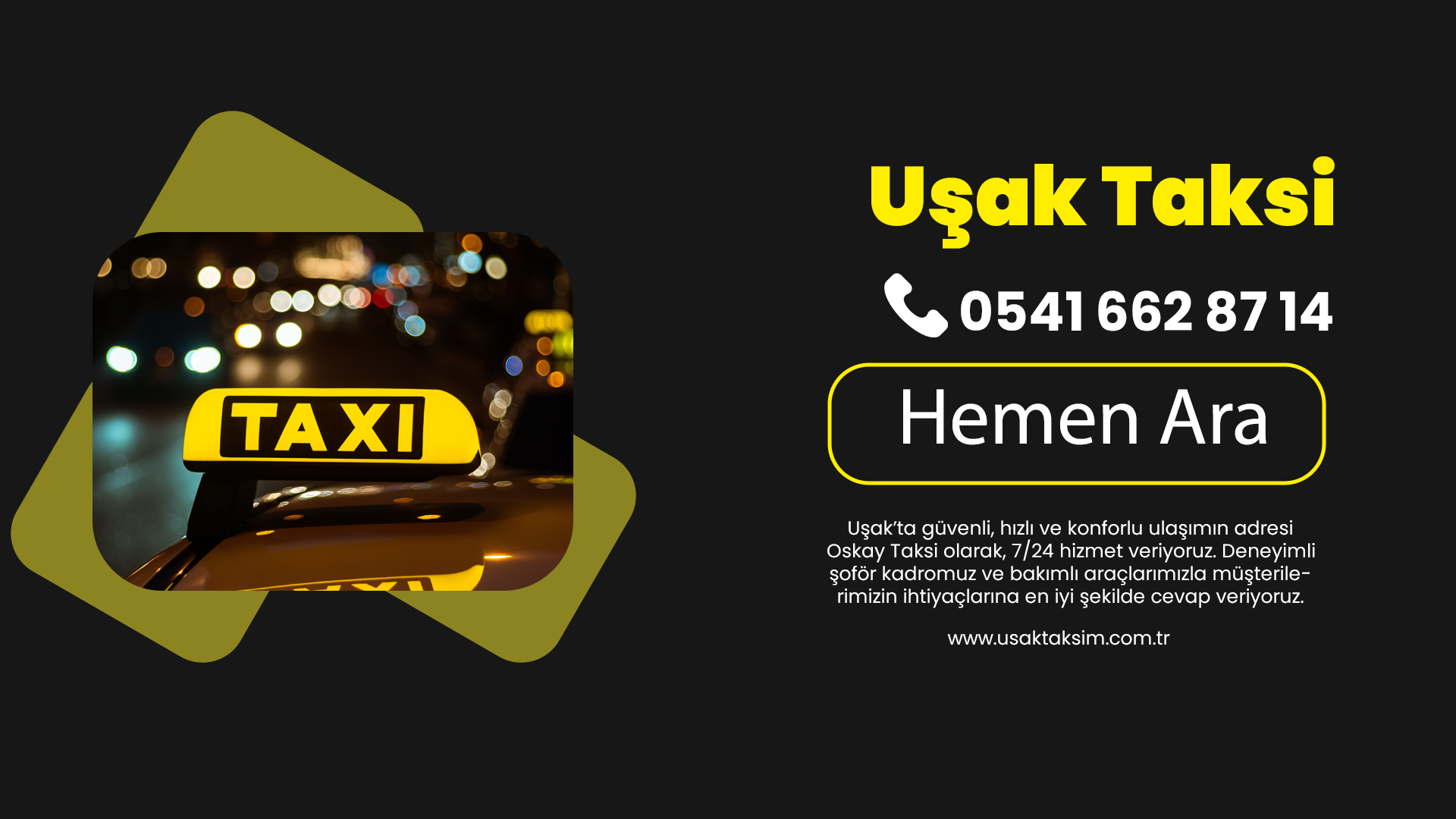 7/24 hizmet anlayışıyla Uşak halkına modern, güvenli ve dakik taksi hizmeti sunar.